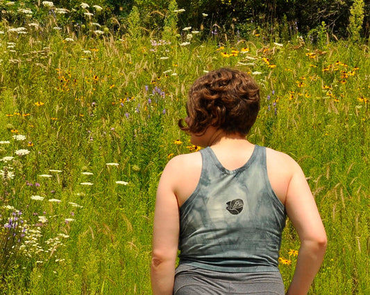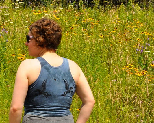 All clothes are thrifted and upcylcled with our hand-printed designs. Images are hand-carved block printing stamps, applied using fabric safe ink for long-lasting wear.